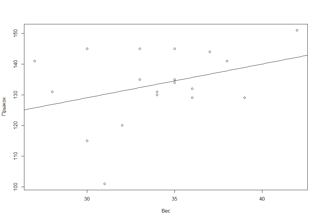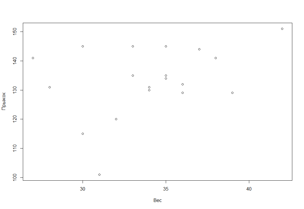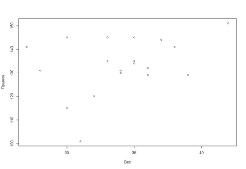 > cor(SM$Вес, SM$Прыжок) [1] 0.346910 |