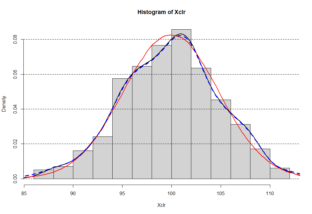 Снова нажимаем клавишу ввода и нашему вниманию предстанет гистограмма (данных без выбросов) и кривые плотности распределения: красным цветом Генеральная совокупность, черным наши данные без выбросов, и наконец синяя прерывистая линия данные с выбросами (для сравнения). На этом работа скрипта завершается.