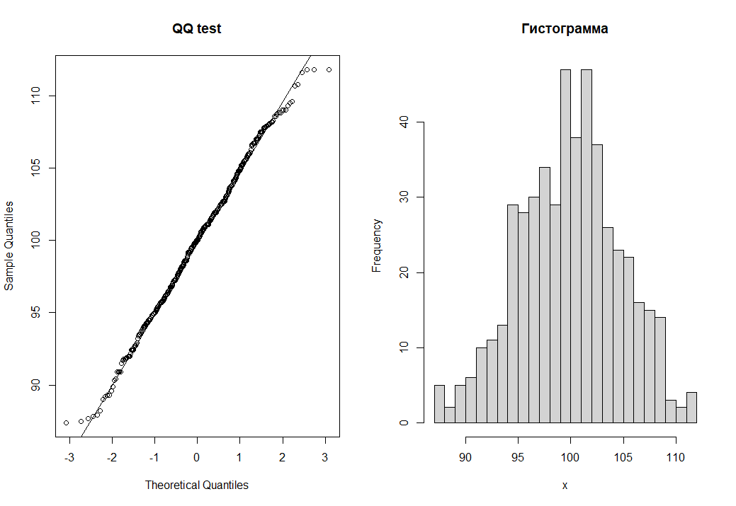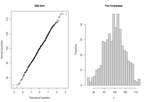 Нажмите [enter] для продолжения N mean median SD As Ex min max 496.00000 99.93952 100.00000 4.81081 -0.06067 -0.28476 87.40000 111.80000 Vx 4.81372 ------------------------------------------------------------ Расчет доверительного интервала для среднего значения с доверительным интервалом: 97 % mean lwr.ci upr.ci 99.94 99.47 100.41 ------------------------------------------------------------ Проверка на нормальное распределение тест Шапиро-Уилка указывает на нормальное распределение данных ------------------------------------------------------------ тест Андерсона-Дарлинга указывает на нормальное распределение данных ------------------------------------------------------------ |