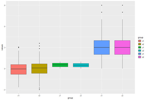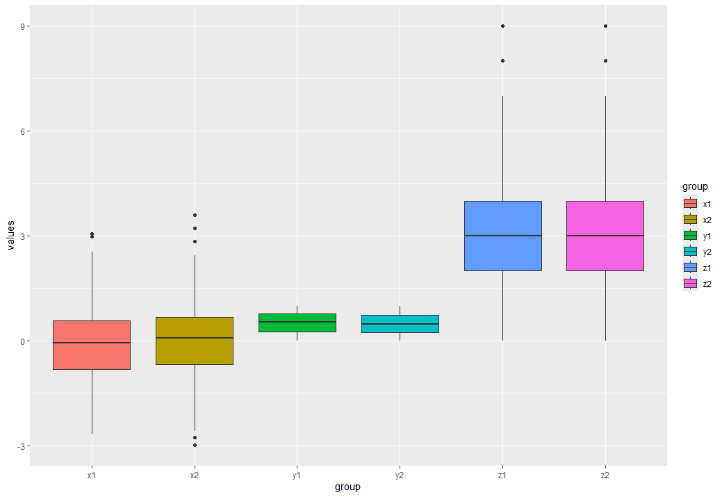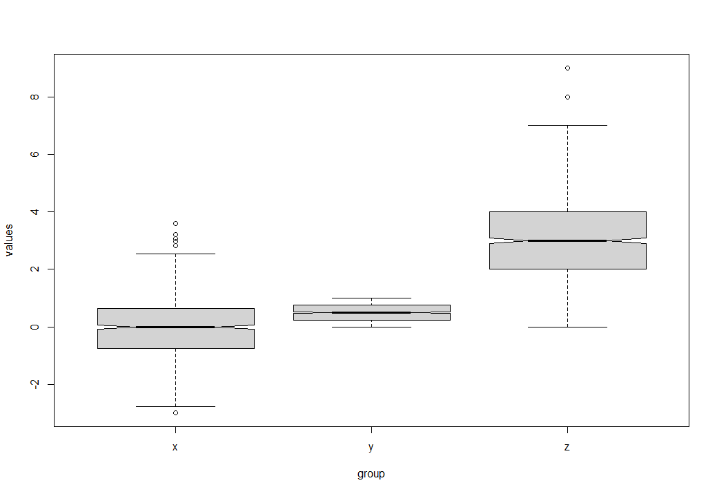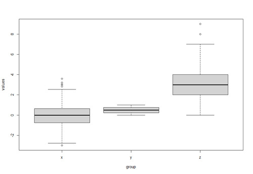 data <- data.frame(values = c(x, y, z), # Combine variables in data frame