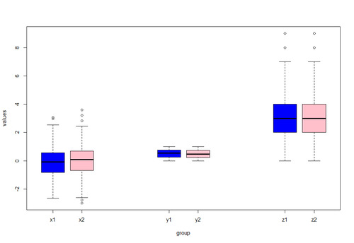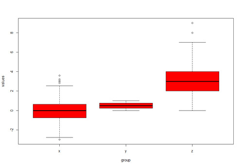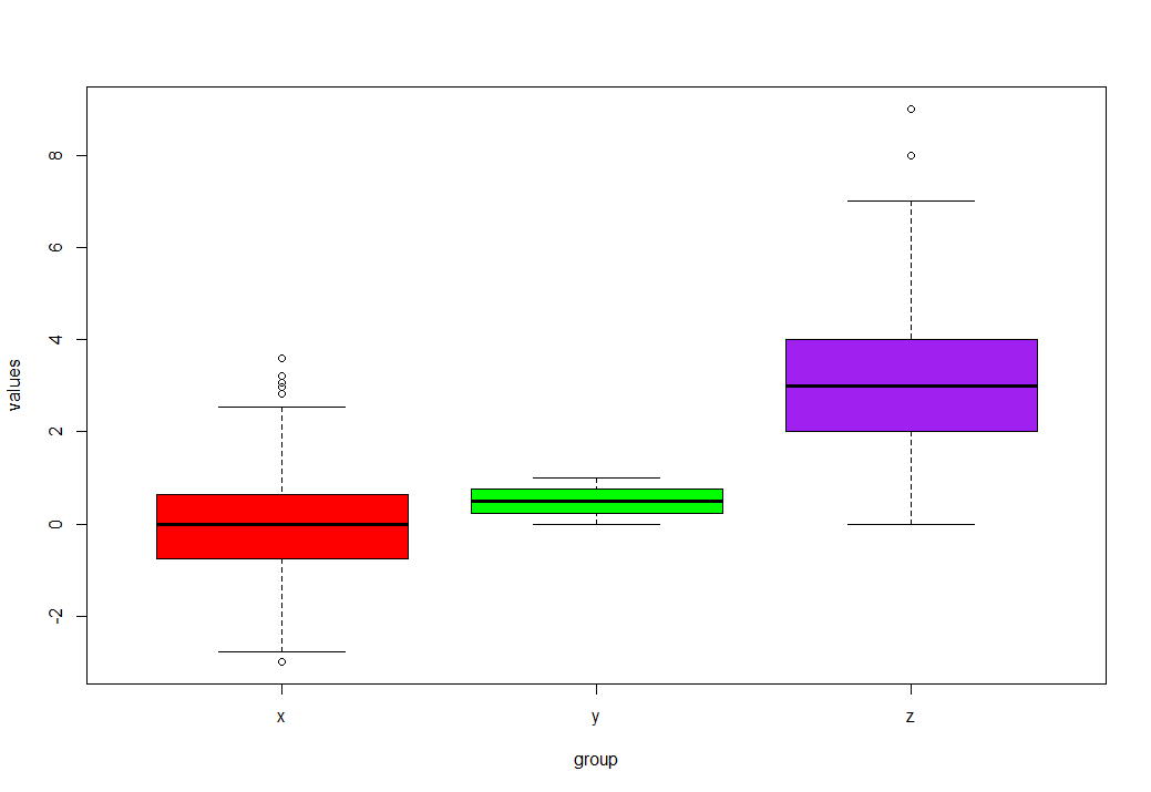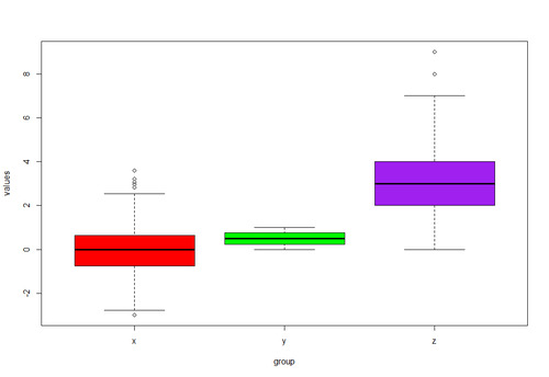 boxplot(values ~ group, data, # Different color for each boxplot