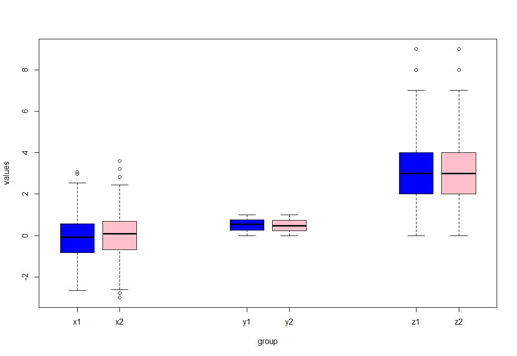 boxplot(values ~ group, data2, # Boxplot with manual positions