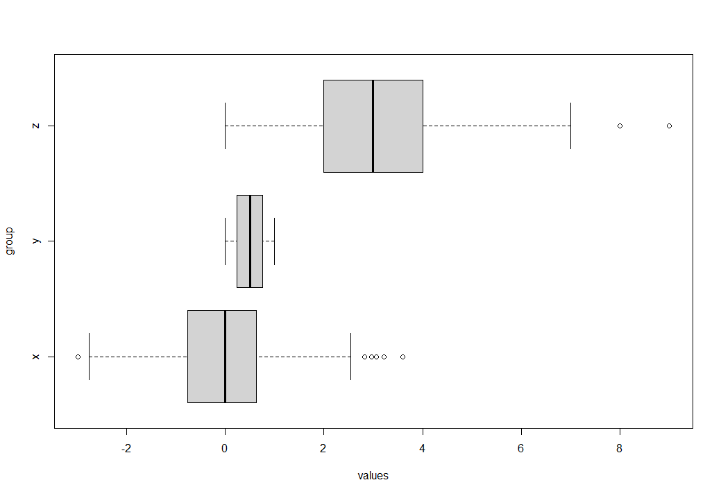 boxplot(values ~ group, data,# Horizontal boxplots