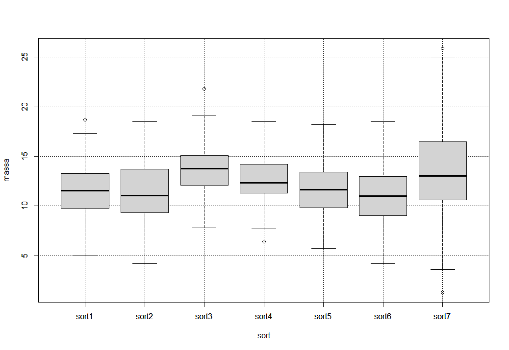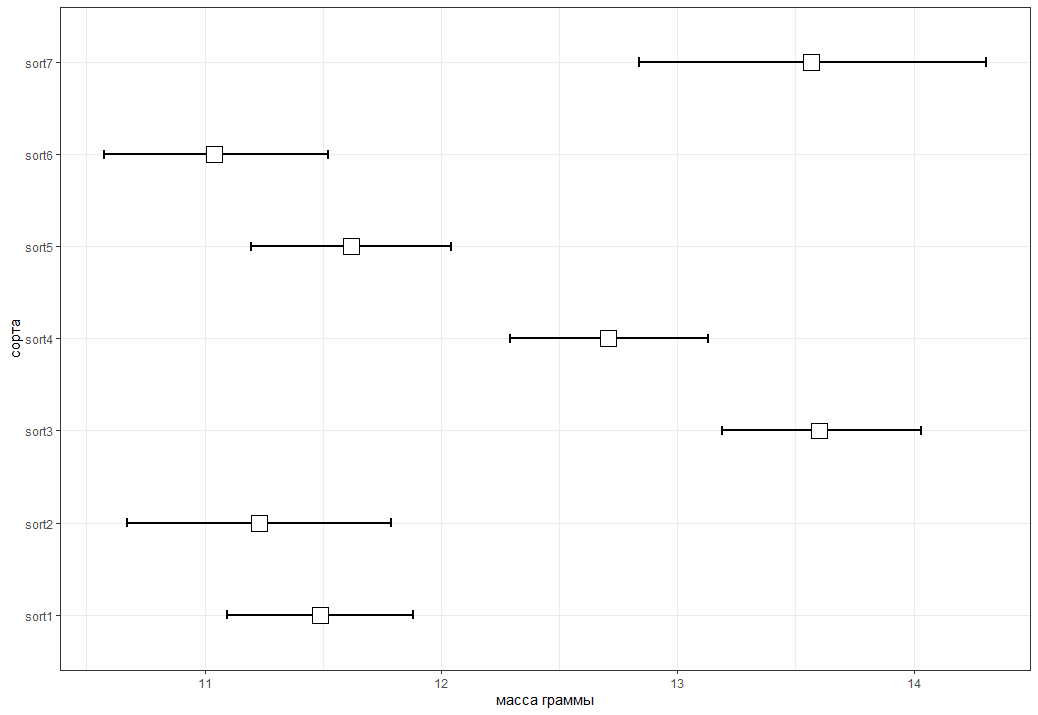 Как видим, все теперь наглядно видно и например sort7-sort3 практически не отличаются p adj = 0.99999994. Вспомним что эти данные были сгенерированы с заданными усчловиями искусственно (среднее арифметическое у них : 13.4 и 13.5 соответсвенно)