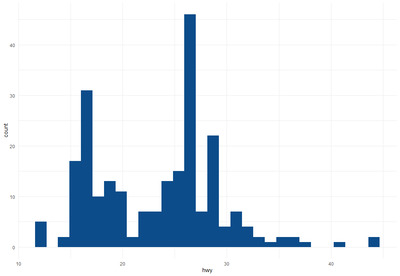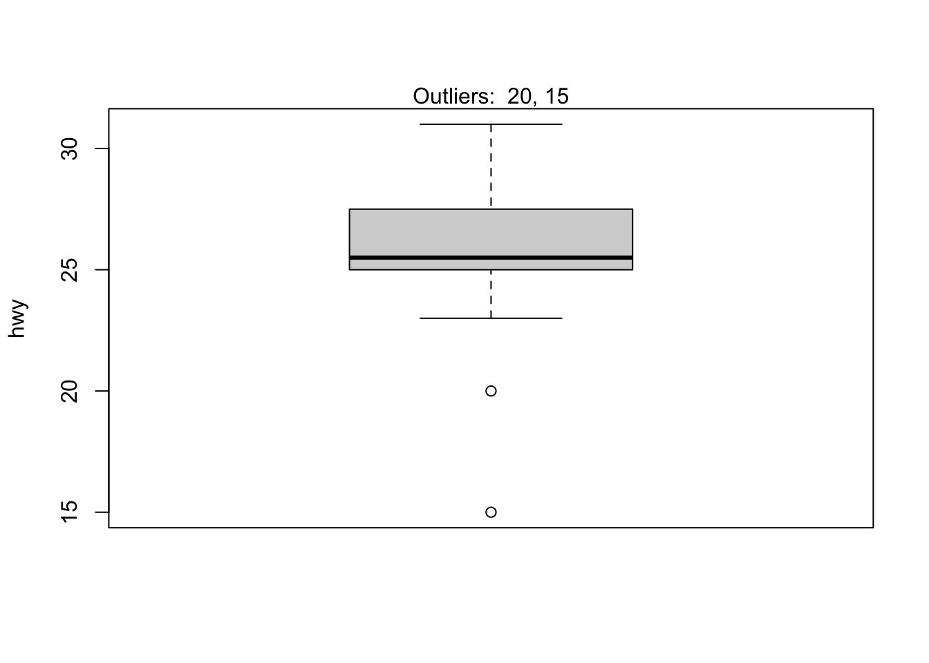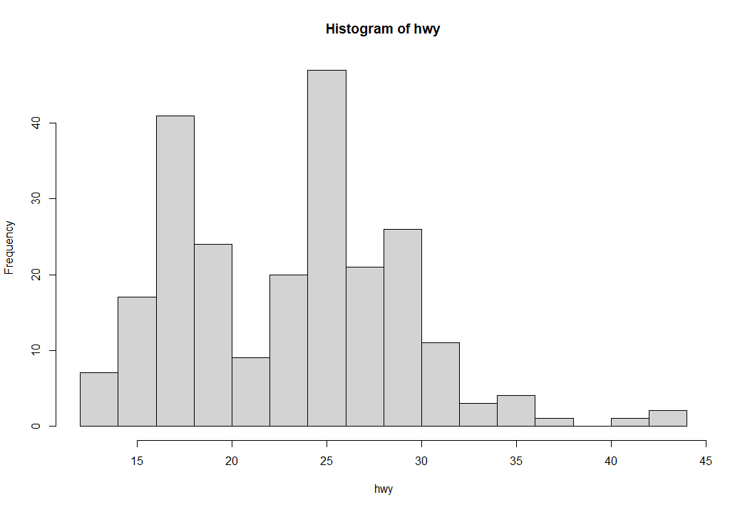 Мы будем использовать набор данных mpg из библиотеки ggplot2, чтобы проиллюстрировать различные подходы к обнаружению выбросов в R, и в частности, мы сосредоточимся на работе с переменной hwy (пробег в милях на галлон израсходованного топлива).