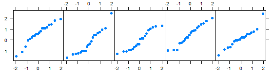 Графики квантилей для пяти случайным образом сгенерированных нормально распределенных выборок (n = 20 в каждой). Обратите внимание на то, что фигура, в которую выстраваются точки на некоторых графиках далека от прямой линии. Причина данного эффекта - в небольшом объеме наблюдений.