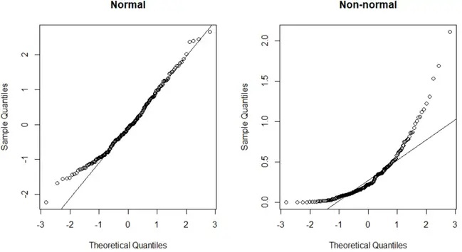 График QQ слева представляет набор данных с нормальным распределением (точки располагаются вдоль прямой диагональной линии), а график QQ справа представляет набор данных с ненормальным распределением.