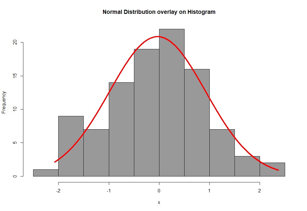 В нашем примере (полный скрипт привожу ниже) мы выдвигаем гипотезу Н0 - данные в векторе подчинены закону нормального распределения. В ходе теста мы получили p-value = 0.6207 что на порядки больше критического значения в 0.05 и следовательно наша Н0 гипотеза в высшей степени верна - выборка действительно имеет нормальное распределение. set.seed(55) x= c(rnorm(100, 0, 1)) plotNormalHistogram( x, prob = FALSE, col="grey60", border="black", main = "Normal Distribution overlay on Histogram", length = 10000, linecol="red", lwd=4 ) qqnorm(x) qqline(x, col='red', lwd=2) shapiro.test(x)