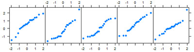 Следует отметить, что интерпретация графиков квантилей при работе с небольшими выборками, происходящими из нормально распределенных генеральных совокупностей, требует определенного навыка. Дело в том, что при небольшом числе наблюдений точки на графике квантилей могут не всегда образовывать четко выраженную прямую линию. В качестве иллюстрации этого утверждения на Рисунке 3 приведены графики квантилей для 5 случайным образом сгенерированных нормально распределенных выборок по 20 наблюдений каждая (если использованный в примере пакет DAAG у Вас не установлен, выполните команду install.packages("DAAG")):