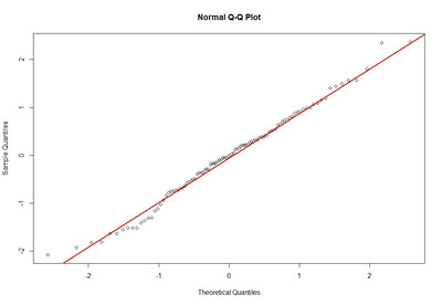 Может показаться что данные не совсем соответствуют нормального распределению (такое бывает при относительно небольшой выборке, в нашем примере вектор случайных значений состоит только из ста вариант, попробуйте самостоятельно увеличить генерацию случайных чисел до 1000 и сравните результаты). Поэтому стоит еще провести другой графический тест. Другим очень часто используемым графическим способом проверки характера распределения данных является построение т.н. графиков квантилей (Q-Q plots, Quantile-Quantile plots). На таких графиках изображаются квантили двух распределений - эмпирического (т.е. построенного по анализируемым данным) и теоретически ожидаемого стандартного нормального распределения. При нормальном распределении проверяемой переменной точки на графике квантилей должны выстраиваться в прямую линию, исходящую под улом 45 градусов из левого нижнего угла графика. Графики квантилей особенно полезны при работе с небольшими по размеру совокупностями, для которых невозможно построить гистограммы, принимающие какую-либо выраженную форму. В R для построения графиков квантилей можно использовать базовую функцию qqnorm(), которая в качестве основного аргумента принимает вектор со значениями анализируемой переменной.