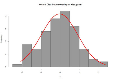 Самый простой графический способ проверки характера распределения данных — построение гистограммы (с помощью функции hist() — это сделать несложно). Если гистограмма имеет колоколообразный симметричный вид, можно сделать заключение о том, что анализируемая переменная имеет примерно нормальное распределение. Однако при интерпретации гистограмм следует соблюдать осторожность, поскольку их внешний вид может сильно зависеть как от числа наблюдений, так и от шага, выбранного для разбиения данных на классы. Скопируйте и выполните скрипт ниже (обратите внимание на кривую нормального распределения красного цвета и гистограмму). Какой можно сделать вывод?