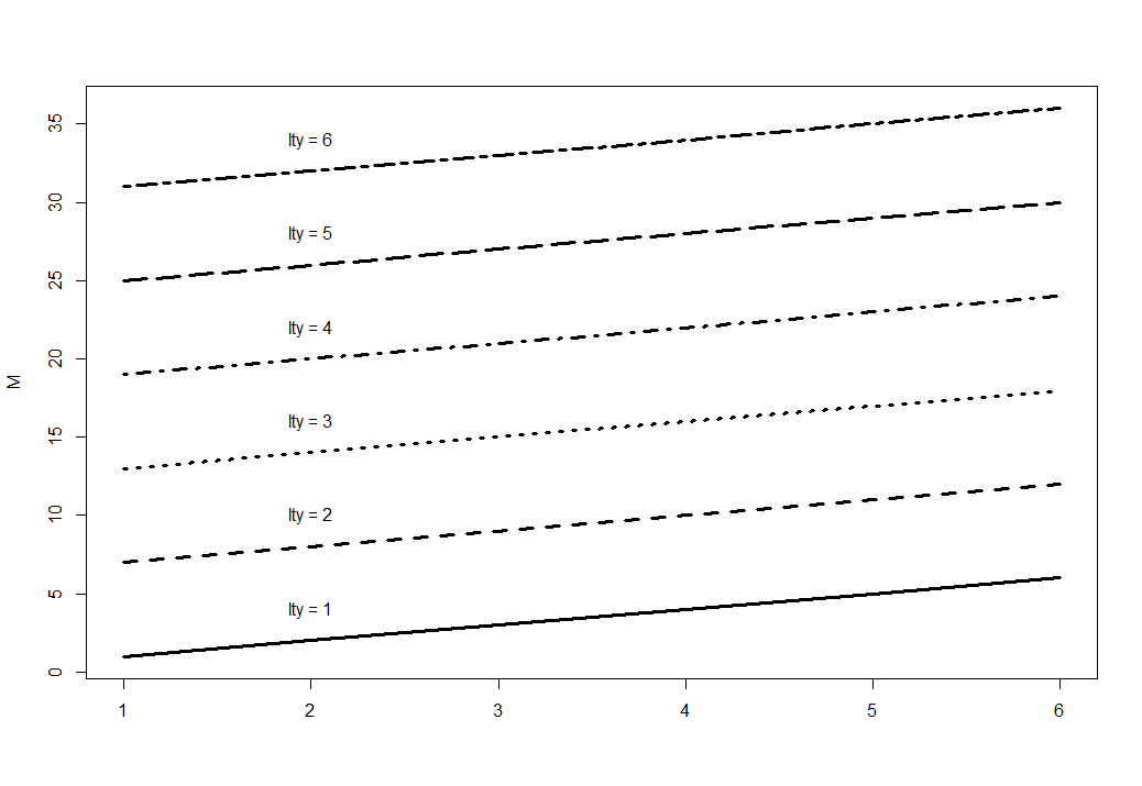 При построении графика типа “l”, “o”, “b”, “s” или при добавлении новой линии поверх графика можно выбирать между различными типами линий, задав lty аргумент от 0 до 6.