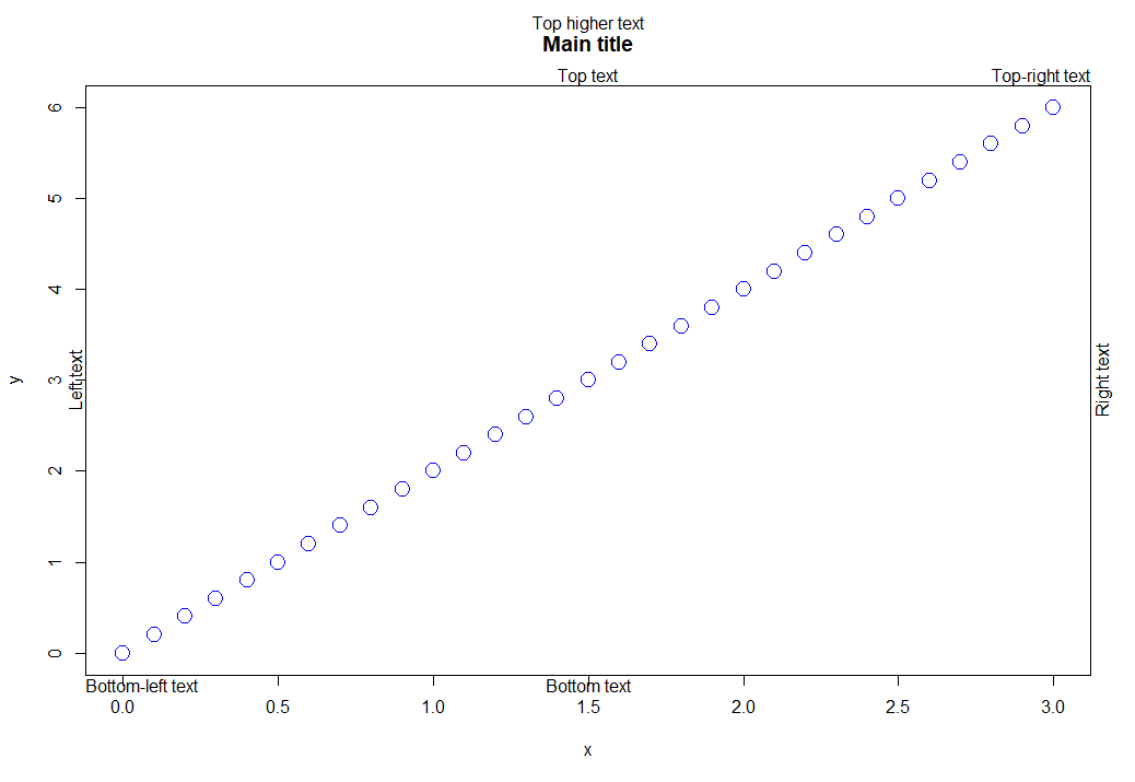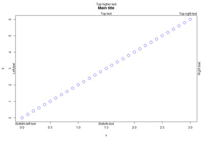 С одной стороны, mtext функция в R позволяет добавлять текст на все стороны поля построения. Существует 12 комбинаций (по 3 с каждой стороны прямоугольника, при выравнивании по левому краю, центру и правому краю). Вам просто нужно изменить side и adj, чтобы получить нужную вам комбинацию.