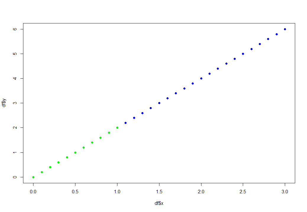 plot(df$x, df$y, col = colors[df$group], pch = 16)