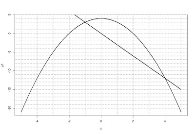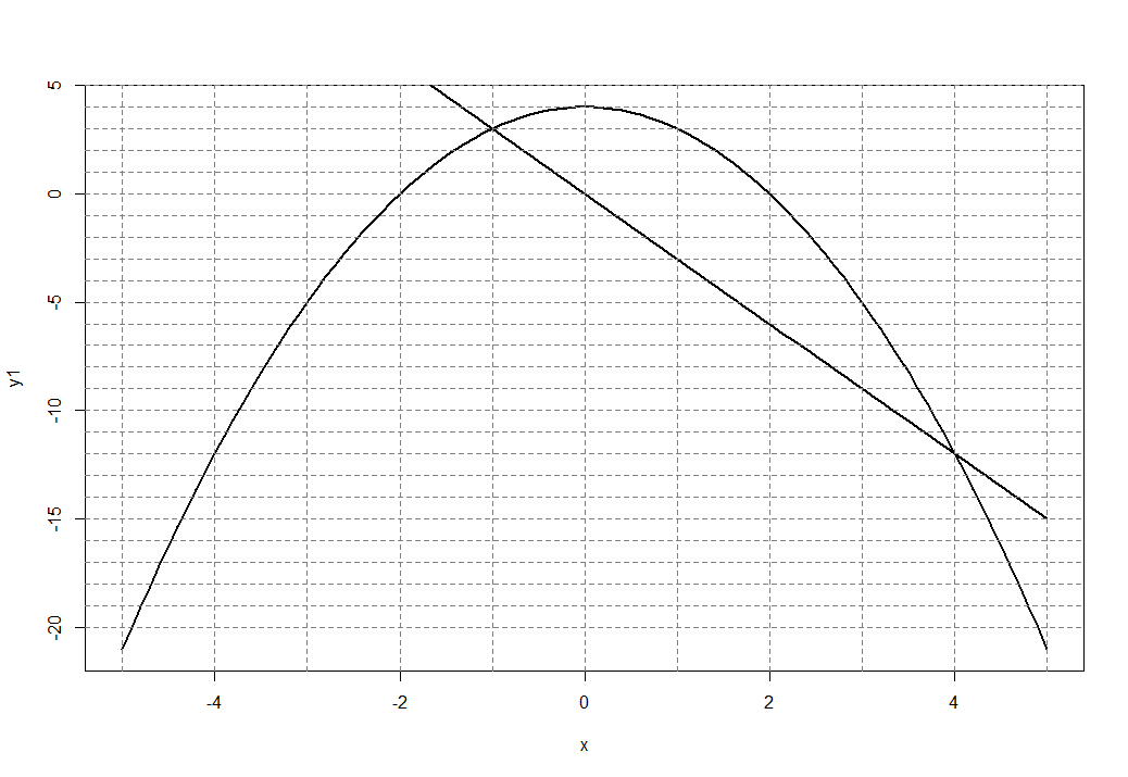 В нашем примере две точки пересечения графиков в точках с координатами (-1, 3) и (4, -12).