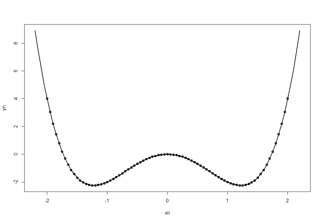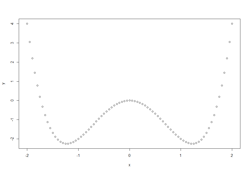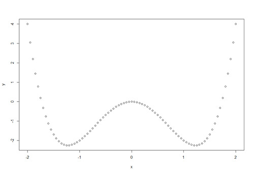 > head(data) x y 1 -2.00 4.0000000 2 -1.95 3.0515063 3 -1.90 2.2021000 4 -1.85 1.4460062 5 -1.80 0.7776000 6 -1.75 0.1914062 |