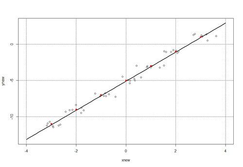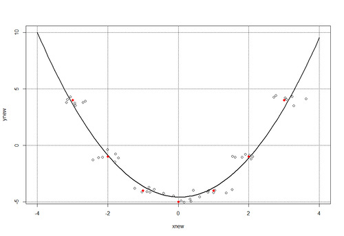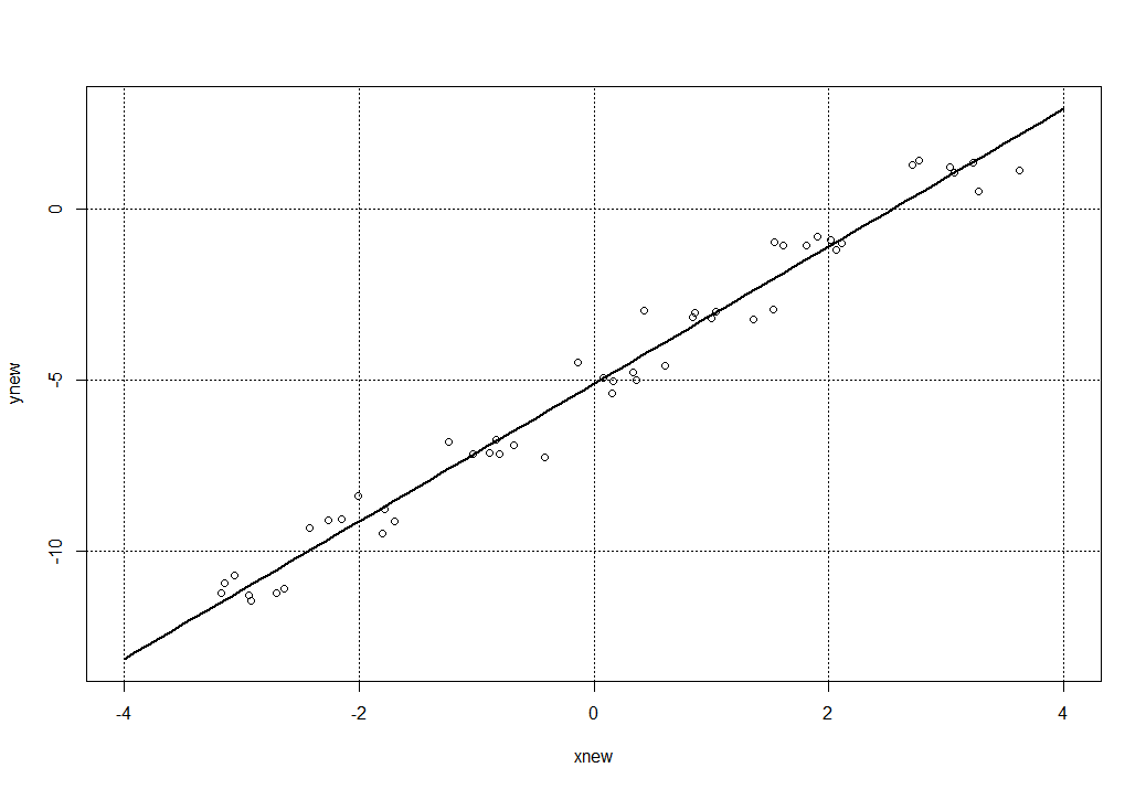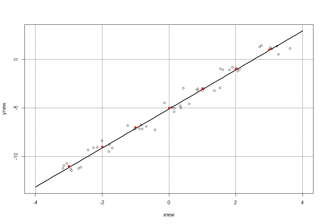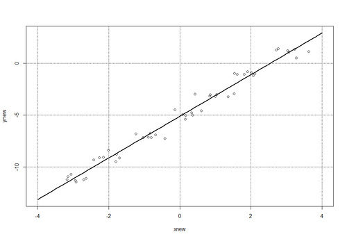 Обратим внимание на параметр degree = 1, который должен указывает на полином второй степени и выше (но мы оставим все без изменений, так как в квадратичной функции вида f(x) = a x^2 + b x + c при а = 0 мы получим линейную функцию (как в нашем примере). А нам осталось по найденной модели models с помощью функции predict получить новые данные (расширим диапазон значений х: xnew = seq(-4, 4, 0.1) и построить график и наложить на него все точки, включая и точки рассеивания функции. Получаем такую конструкцию: