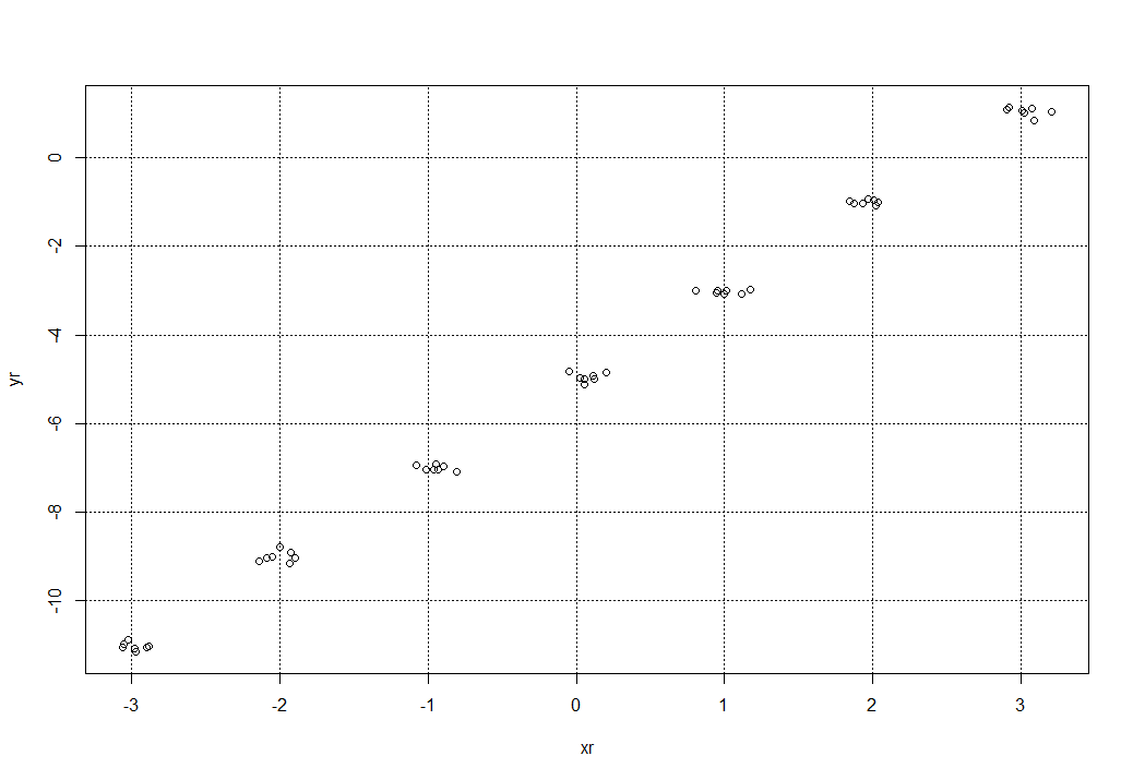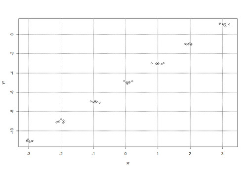 Обратим внимание на полученный график рассеивания, мы получили вокруг исходных точек, заданных исходной функции x и y по 5 дополнительных разбросанных случайных точек. Величину разброса можно увеличить, увеличив значение, например при sd = 0.3 получим уже такую картину: