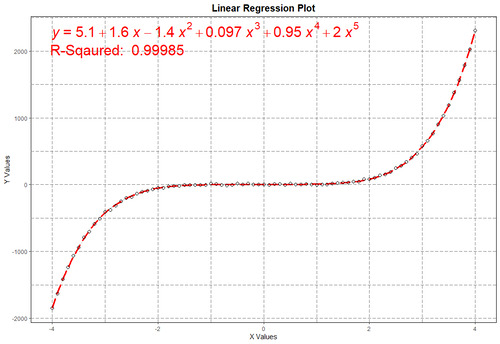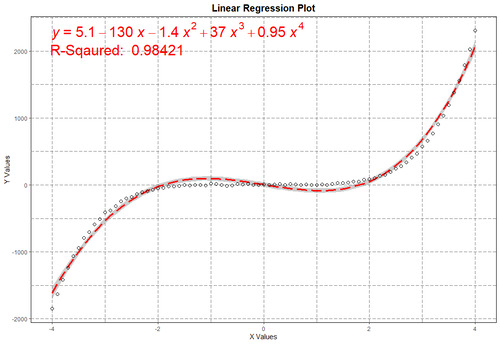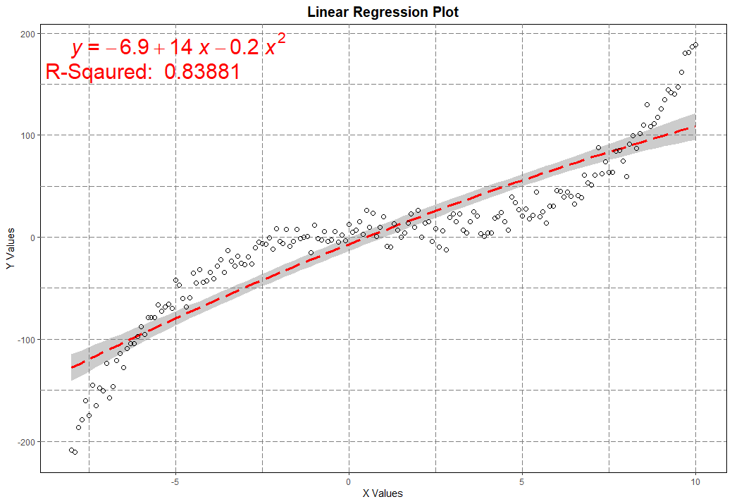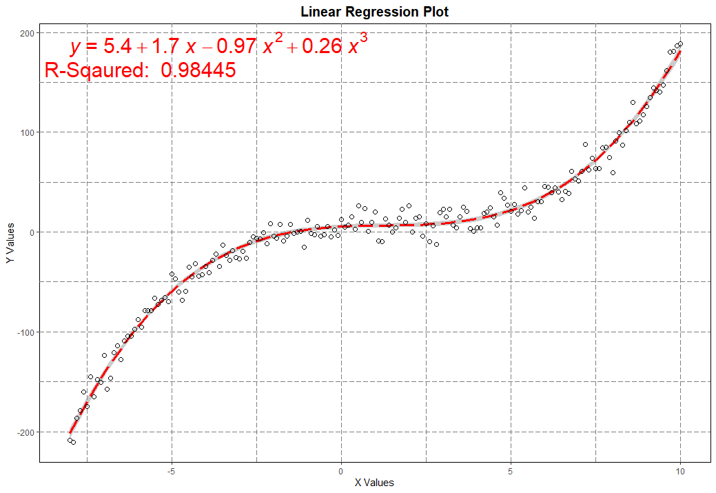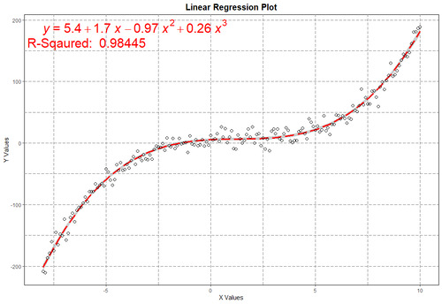 Несмотря на то что функция y = 0.25*x^3 - x^2 + 2*x + 5 является кубической, мы начнем анализ со степенью полинома равным двум. Так же добавим небольшую погрешность y = 0.25*x^3 - x^2 + 2*x + 5 + rnorm(length(x), 5, 30). Вот теперь проведем регрессивный анализ данных предположив что они исходят от квадратической функции (Poly = 2 #степень полинома)