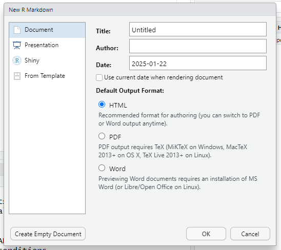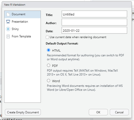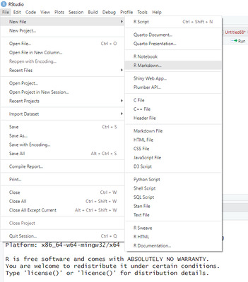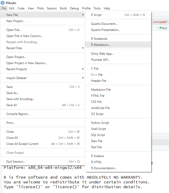 Давайте попробуем создать наш первый R Markdown(.Rmd) файл. Там, где мы создаем скрипт нужно выбрать R Markdown.