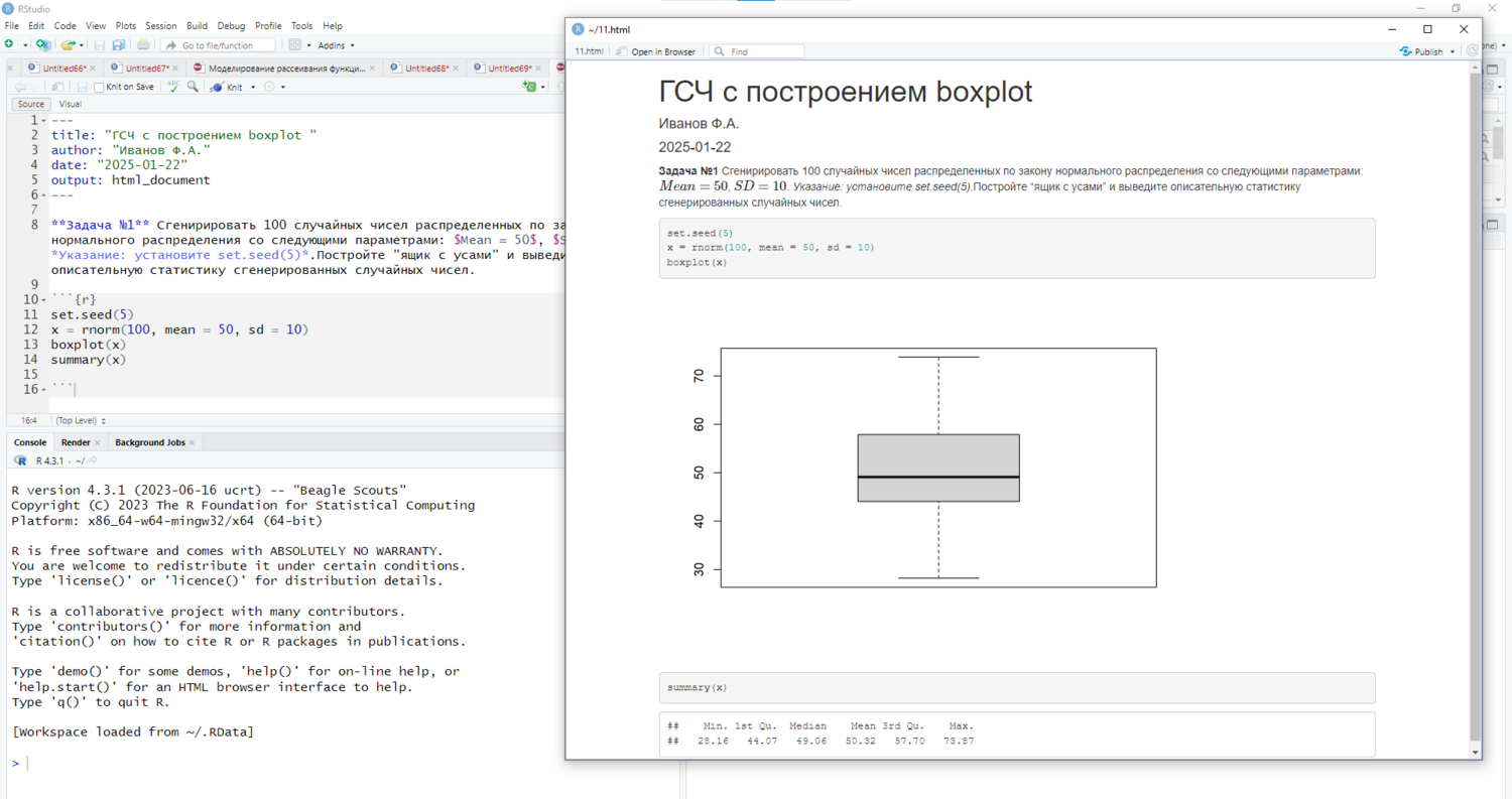 --- **Задача №1** Сгенирировать 100 случайных чисел распределенных по закону нормального распределения со следующими параметрами: $Mean = 50$, $SD = 10$. *Указание: установите set.seed(5)*.Постройте "ящик с усами" и выведите описательную статистику сгенерированных случайных чисел. ```{r} ``` |