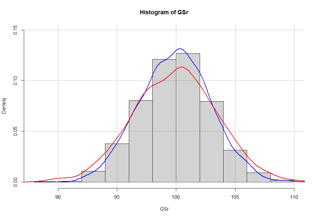 > tt2 [1] 0.9916289 > hist(GSr, freq = F, ylim = c(0, 0.15)) > lines(density(GSr), lwd = 2, col='blue') > lines(density(GS), lwd = 2, col='red') > grid(col='grey50') > t.test(GSr, GS,conf.level = 0.97) Welch Two Sample t-test data: GSr and GS t = 0.010492, df = 3898.5, p-value = 0.9916 alternative hypothesis: true difference in means is not equal to 0 97 percent confidence interval: -0.2223671 0.2245271 sample estimates: mean of x mean of y 99.91050 99.90942 |