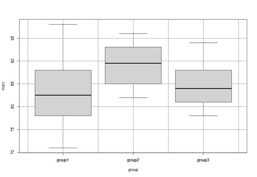 > ans=TukeyHSD(tmarc) > ans Tukey multiple comparisons of means 95% family-wise confidence level Fit: aov(formula = marc ~ group, data = df) $group diff lwr upr p adj group2-group1 5.9 -1.179418 12.979418 0.1159908 group3-group1 1.3 -5.779418 8.379418 0.8924770 group3-group2 -4.6 -11.679418 2.479418 0.2583517 |