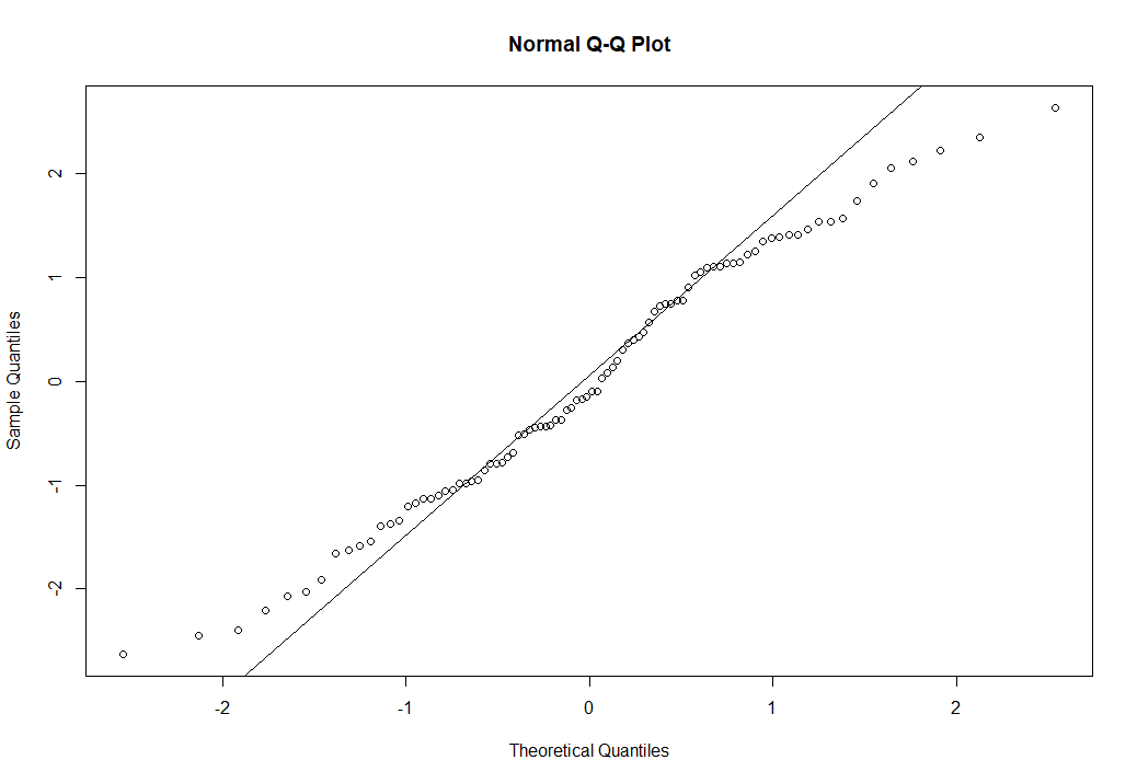 В общем, если точки данных лежат вдоль прямой диагональной линии на графике QQ, то набор данных, скорее всего, соответствует нормальному распределению. В этом случае мы видим заметное отклонение от линии по концам, что может указывать на неправильное распределение данных.