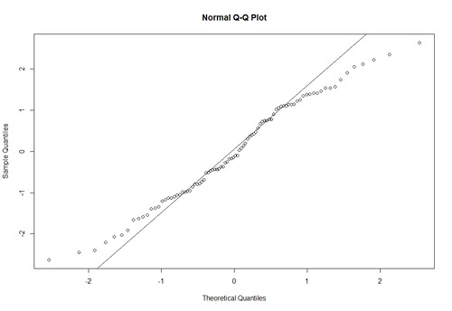 #create QQ plot to compare this dataset to a theoretical normal distribution qqnorm(model$residuals) #add straight diagonal line to plot qqline(model$residuals)