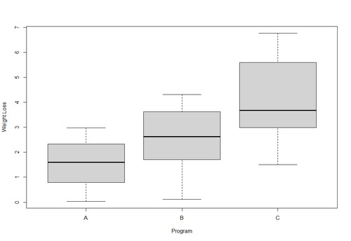 #Create box plots that show distribution of weight loss for each group boxplot(weight_loss ~ program, xlab=' Program ', ylab=' Weight Loss ', data=data)
