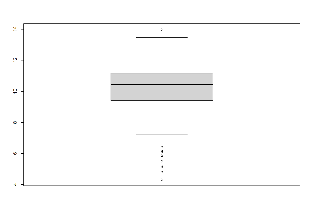 Наглядно видно большое количество данных сильно отклонившихся (они отображаются кружочками). Для удаления выбросов воспользуемся простой конструкцией (параллельно создадим новый вектор без выбросов)